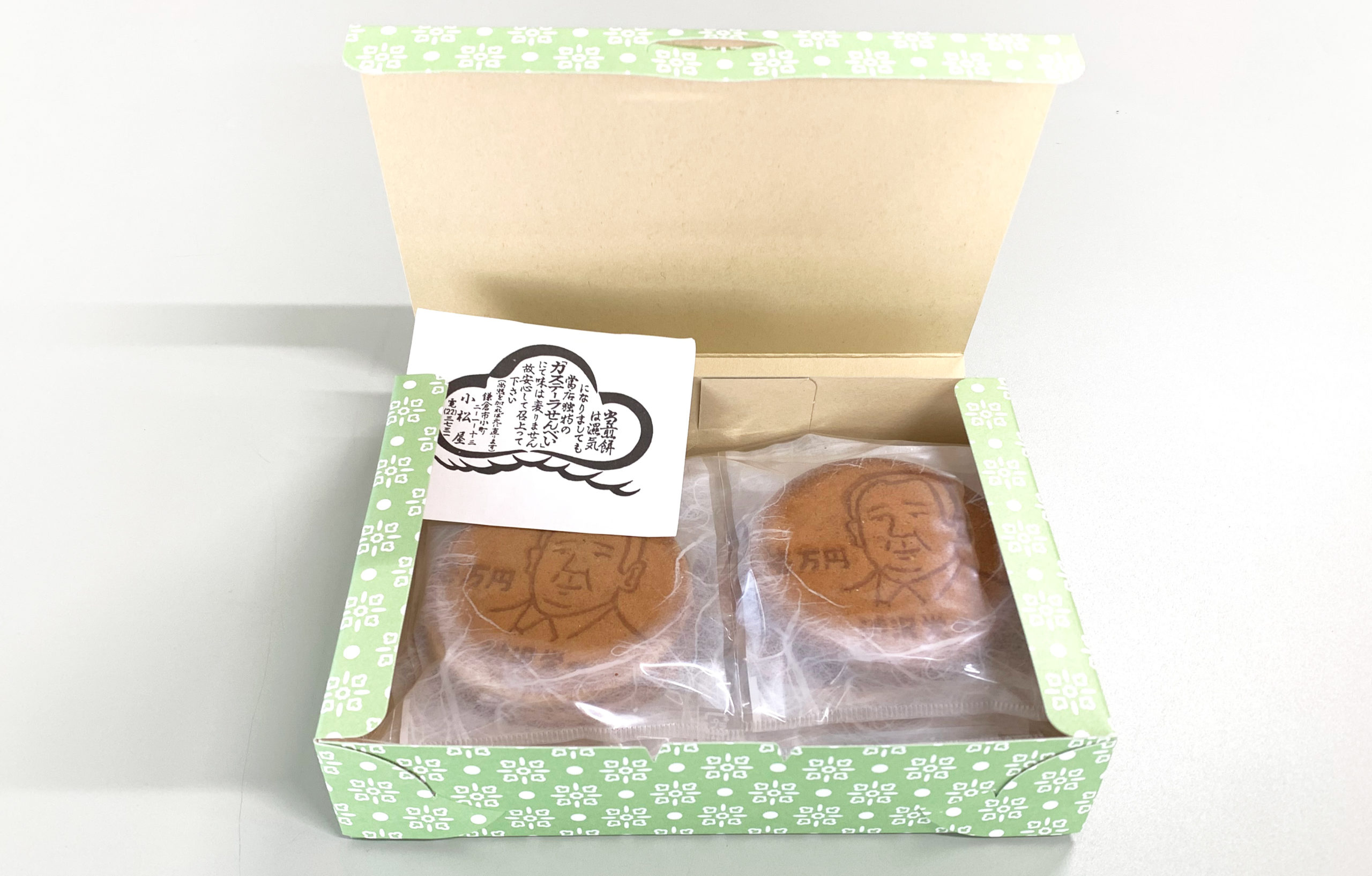 新お札せんべい 新お札せんべい (FO-100501) カステラの原料で焼く極上の「瓦せんべい」に新しいお札の絵柄に採用されました 3名の偉人が焼かれた「新お札せんべい」! 1909年創業以降、品質と味にこだわり続けている鎌倉の老舗「小松屋」で作っています。 各絵柄 4枚 計12枚入り 箱サイズ 18.5cm × 12.5cm × 4.5cm 新お札せんべい 在庫状態 : 在庫有り ¥900(税込) 数量